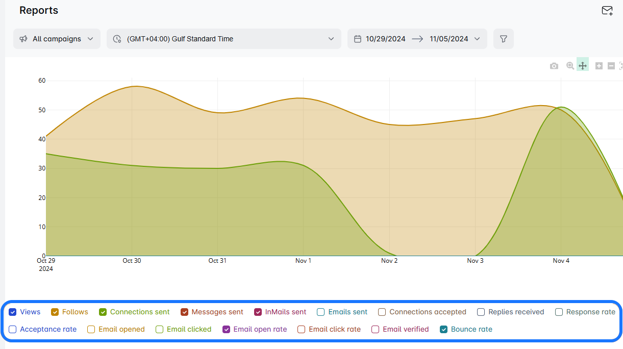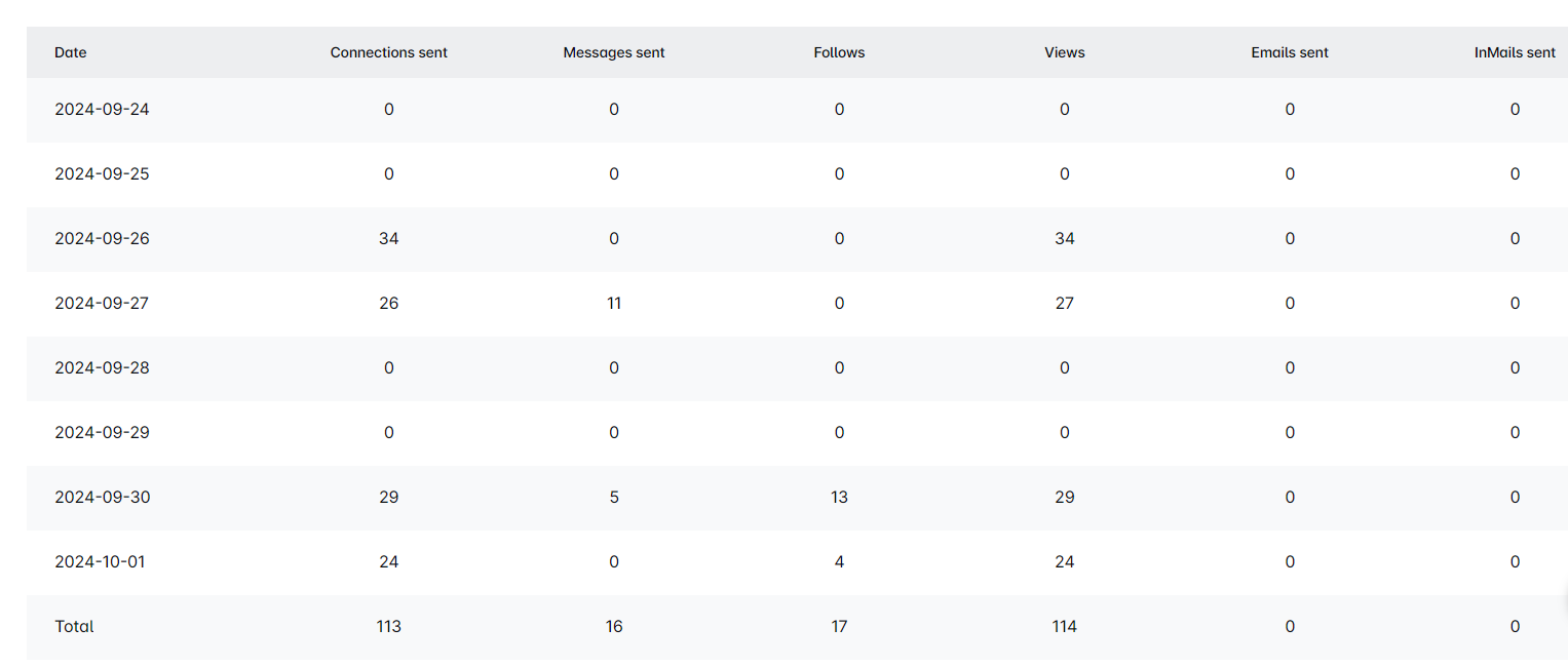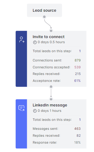 Scroll down for a detailed breakdown of each campaign step. See how many connections were sent, replies received, and emails/messages dispatched by LeadGenHub. It varies based on your campaign type and the steps included. Easily spot where your leads stand in the campaign.