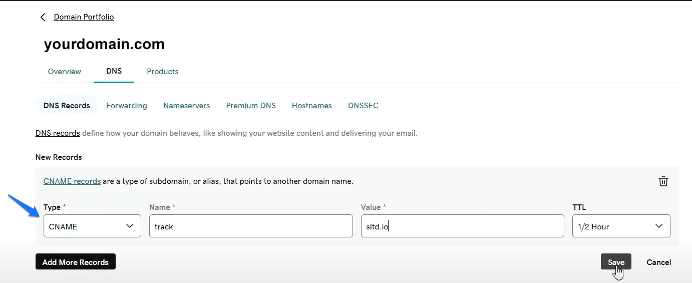 - This time, under record type in the dropdown menu, find CNAME, and paste the details provided in LeadGenHub’s Custom tracking domain settings.