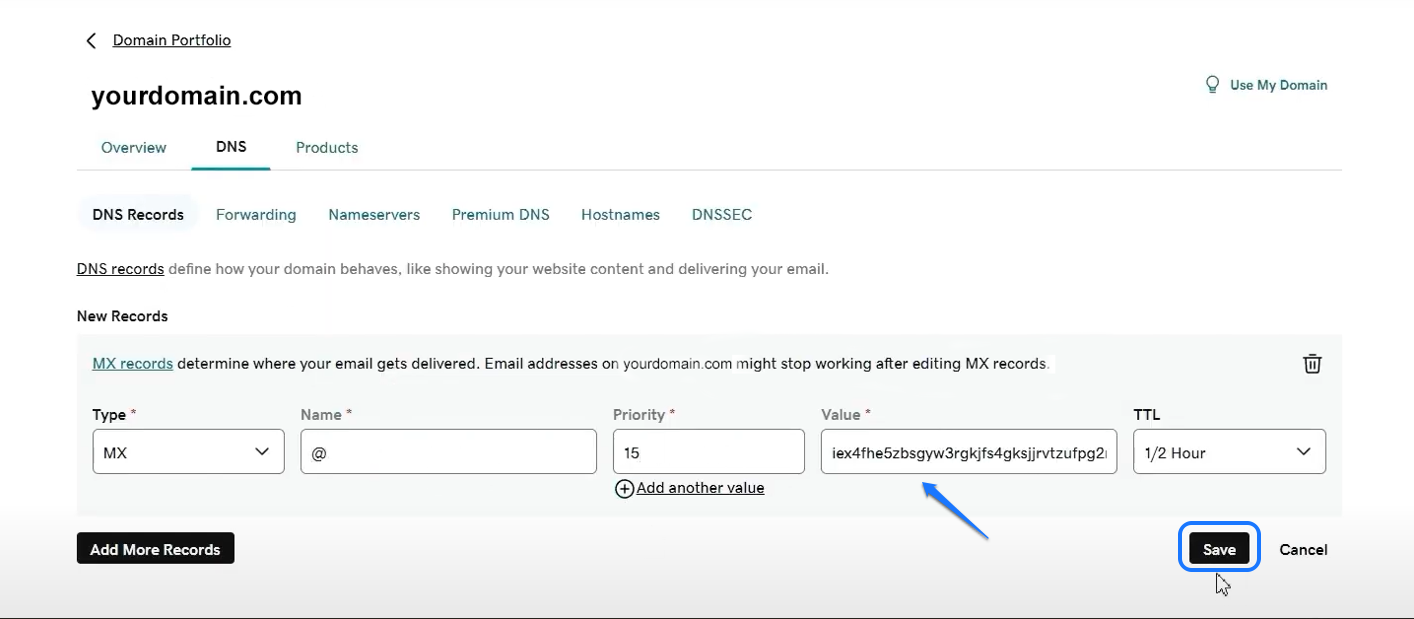 🔔 Here’s how adding your MX record should look like in GoDaddy.
