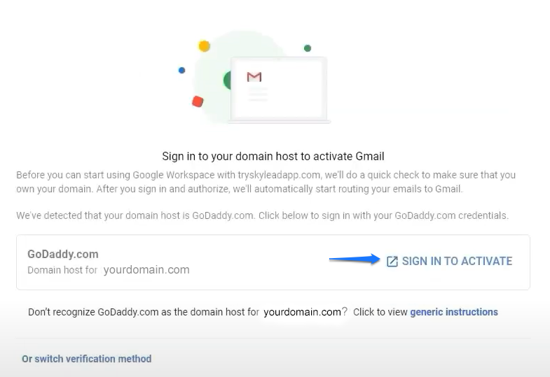 After the previous step, a new tab will open, where you’ll be able to Sign in to your domain host with a one-click sign-in to activate Gmail.
